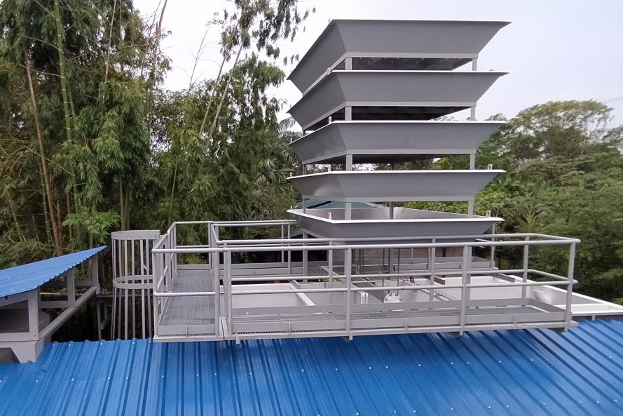 Este sistema está compuesto por una serie de bandejas en PRFV ensambladas en una estructura en acero carbón. Las bandejas poseen una serie de orificios (Según diseños) y se pueden rellenar con material plástico, carbón coque o carbón activado. El agua cruda deberá ingresar por la parte superior y descargarse en la primera bandeja, atravesar el material de relleno y descargarse por gravedad hacia la bandeja #2 y así sucesivamente.